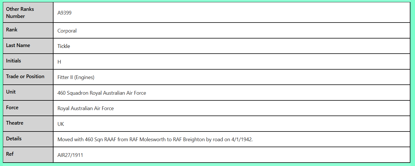 A9399 Corporal H Tickle Royal Australian Air Force Empire Forces WW2 Records