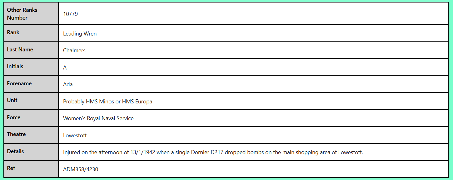 Air Raid casualties. The Luftwaffe launched well over 100 raids on Royal Navy bases in the UK. Those killed and wounded are gradually being added to the database.